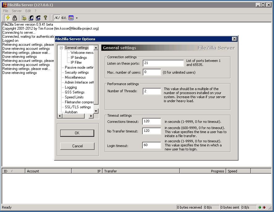Port Filezilla Server : Kody's blog: Set up FileZilla Server / Now one last major configuration remains to be made in the system to allow connections to this server, ie we need to open the ftp port on the .. 0.1) and admin port (14147) as default. The quickest and easiest way to establish a. The default port is 21, but this field is not mandatory. Type a new password (you will use this password for administering the filezilla ftp server) and press connect. The port will automatically default to 21 if left blank.